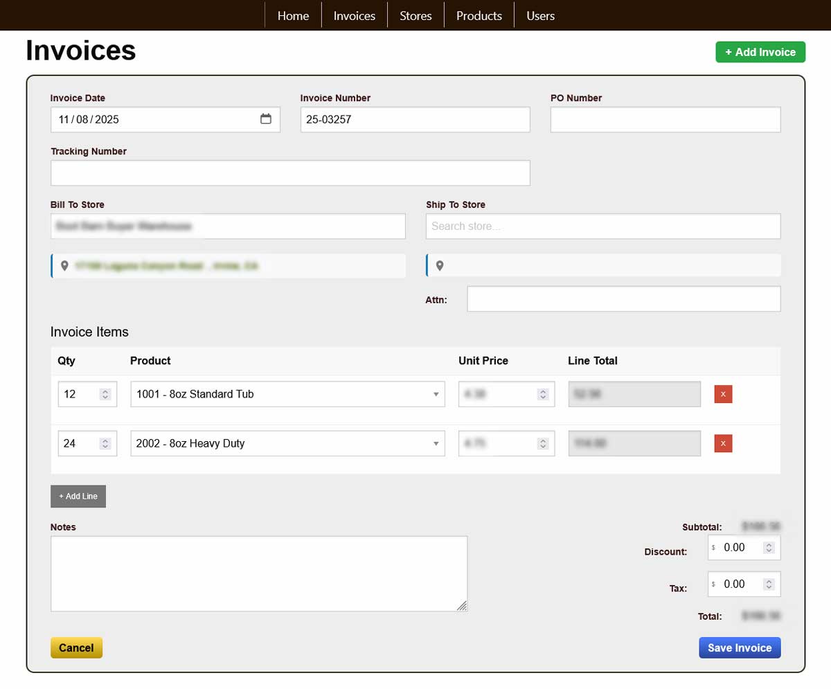 Behind the scenes, I developed a custom invoicing and order management system to replace a manual Excel-based workflow. The new system allows the team to create invoices, track shipments, and manage store accounts efficiently - all from any location. This not only eliminates repetitive administrative work, but also improves accuracy and speeds up order fulfillment.
