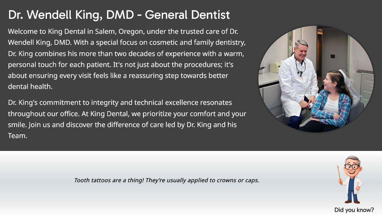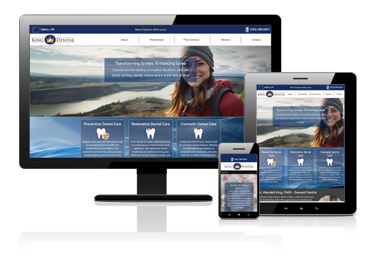 A fresh redesign for King Dental in Salem. This custom design includes a landing page for all primary dental services. It also has a "dental facts" section on most pages to add interesting information for the reader and additional dental terms and content for improved SEO.